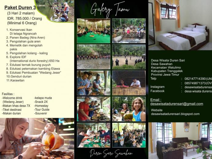 Desa wisata ini dibangun awalnya karena keprihatinan warga yang kondisi lingkungan terutama sungai kurang bersih, produksi pertanian melimpah namun tidak terpasarkan dengan baik. Atas kegigihan dan gotong royong masyarakat, timbul upaya untuk melakukan konservasi lingkungan melalui pembersihan sungai, rehabilitasi tanaman hutan, pemeliharaan sumber air dan menggali kembali seluruh potensi kearifan lokal yang dimiliki. Upaya ini diikuti dengan inisiatif sekelompok warga dengan membentuk pokdarwis pada tahun 2015 dengan nama Pokdarwis Duren Sari. Komitmen dan semangat untuk mewujudkan desa wisata sehat, ramah lingkungan, melestarikan budaya dan mengangkat kearifan lokal berbasis masyarakat untuk meningkatkan kesejahteraan ekonomi masyarakat. Sehingga pada tahun 2017 diberi SK oleh Dinas Pariwisata dan Kebudayaan kabupaten Trenggalek nomor. 556/141/35.03.025/2017.