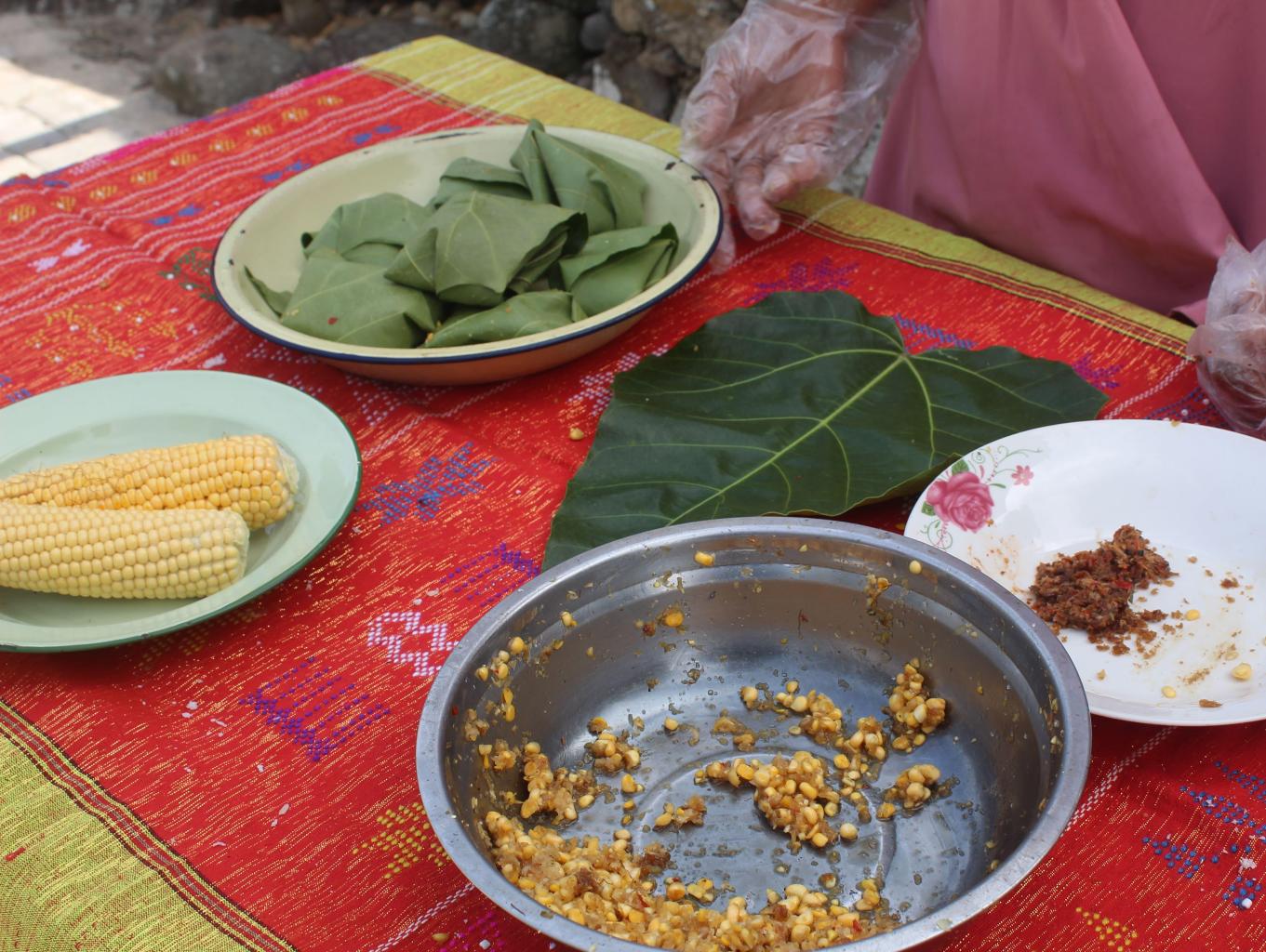 - Siapkan daun kemiri, sebagai pembungkus makanan, taruh campuran bahan diatas kedalam daun kemiri, lipat satu persatu-satu;