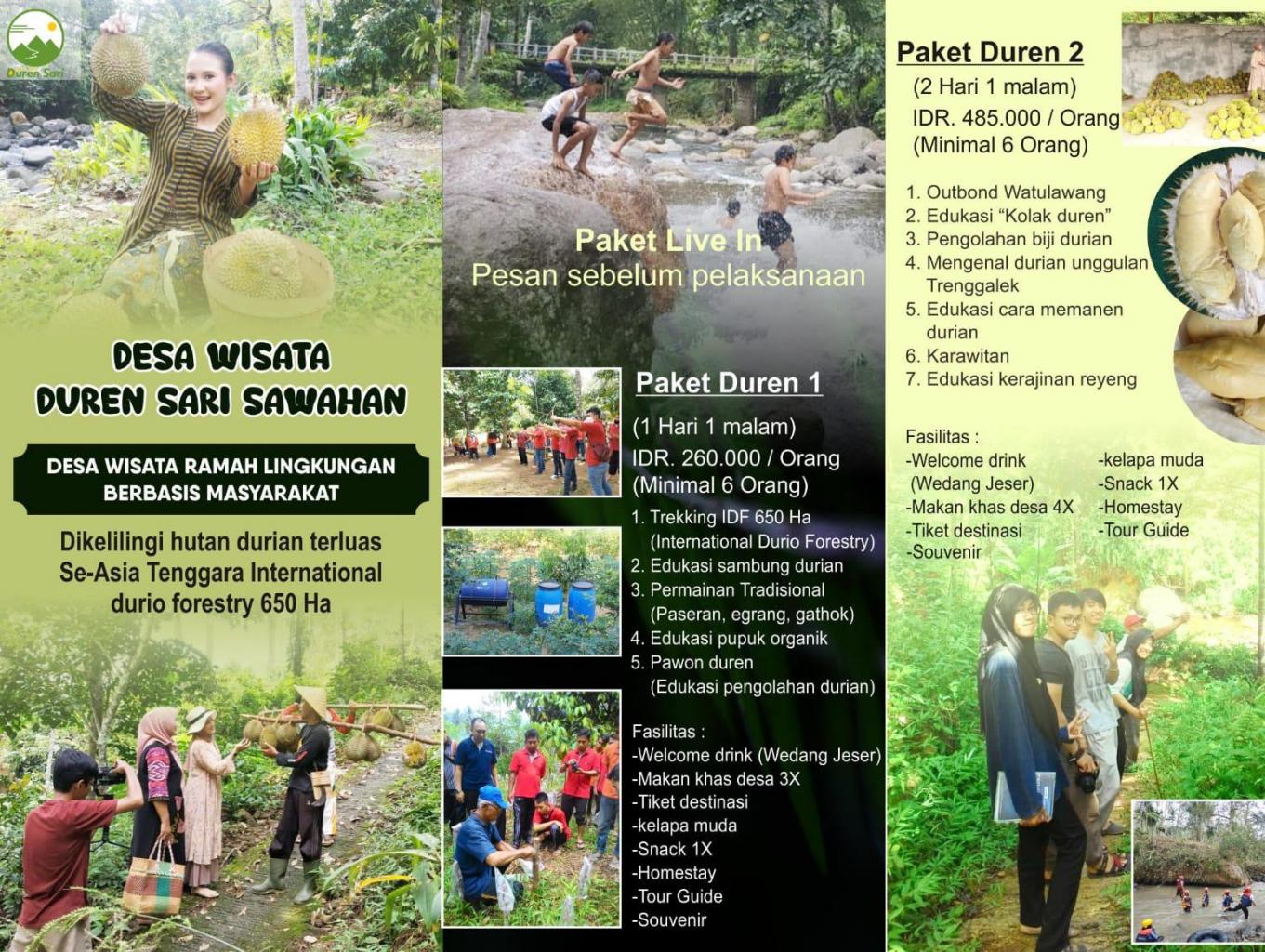 Wisatawan menjelajahi hutan durian, belajar edukasi sambung durian, dan mengenal berbagai macam jenis durian lokal yang berumur ratusan tahun. bermain paseran jika dari bahan alam blarak (daun kelapa) dan bambu. Jika tepat sasaran mendapat hadiah durian. Belajar pupu organik dari kulit durian, daun durian bersama kelompok tani. Wisawatan belajar mengolah makanan dari durian di pawon duren (rumah durian)
